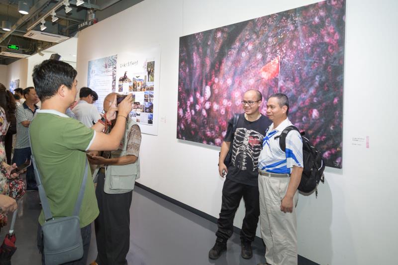 包養省文聯副主席、廣州市文聯主席李鵬程,廣州市手機攝影藝術協會會長陳金成向不雅眾先容影展作品
